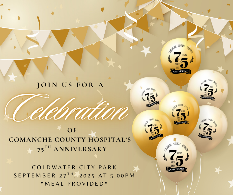 Comanche County Hospital warmly invites our communities to join us as we celebrate 75 years of dedicated service. A meal and water will be provided. Please bring lawn chairs for your comfort. We are proud to share this exciting milestone with the people of Comanche County and their families.
